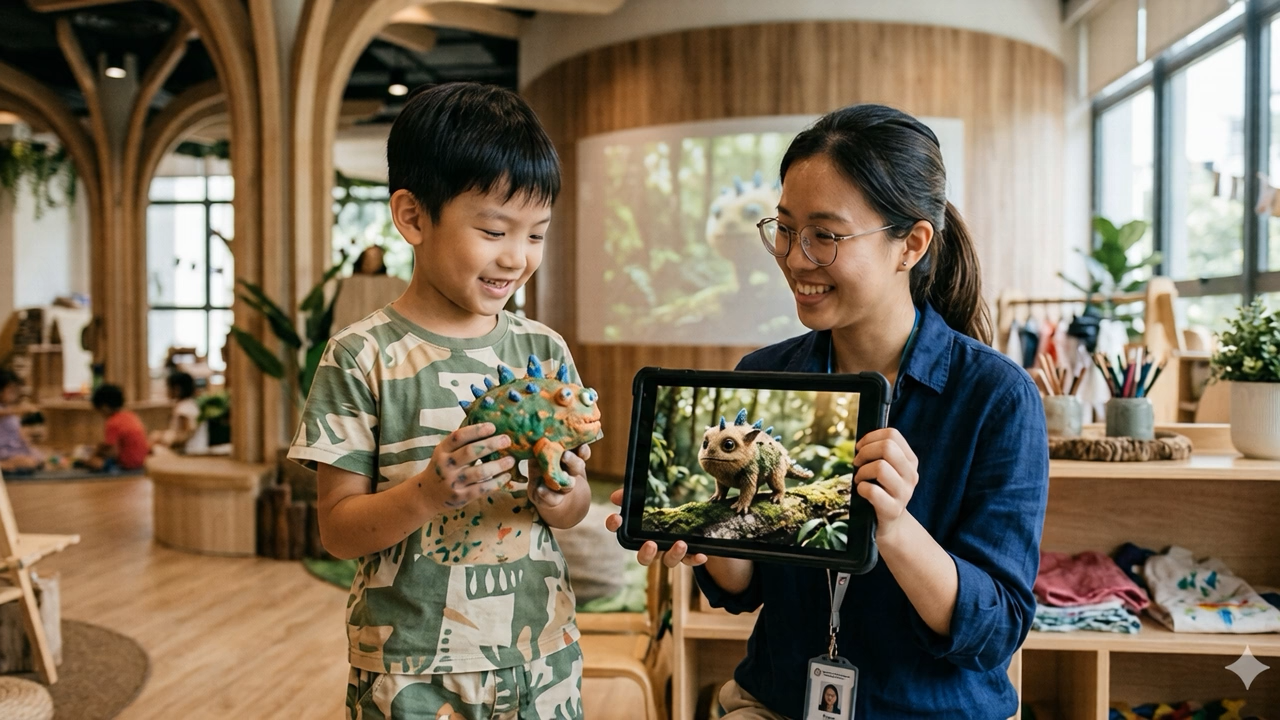 He leans forward. He starts asking questions. ‘Can it have wings? Can the parrot talk?’ He is no longer a spectator. He is a creator. And he is just getting started.