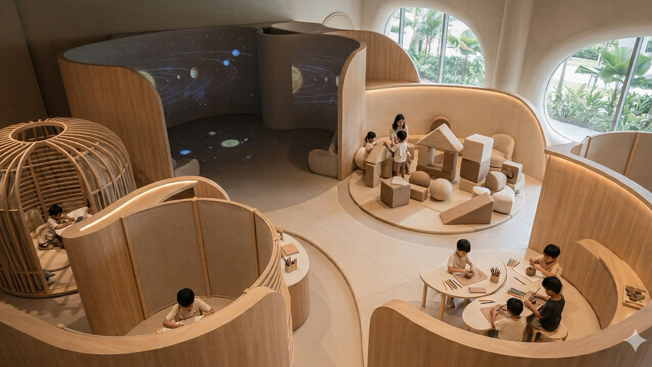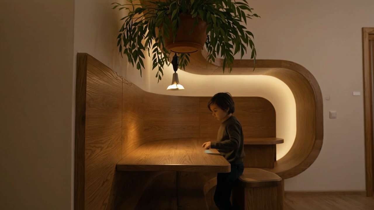 The AI is invisible. Your child never stares at a chatbot. They create through touch, voice, and movement. The immersive room is not virtual reality. It is their creation projected into physical space. They are standing in it, not escaping into it.